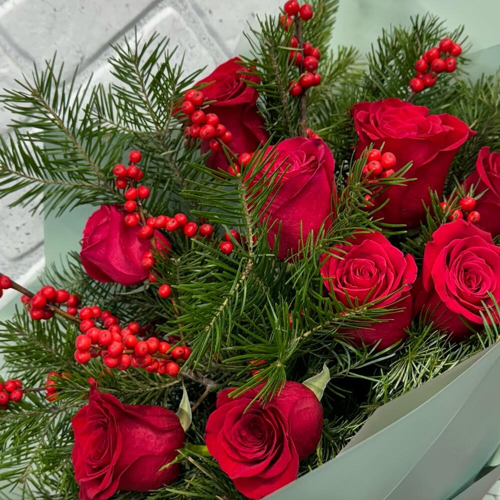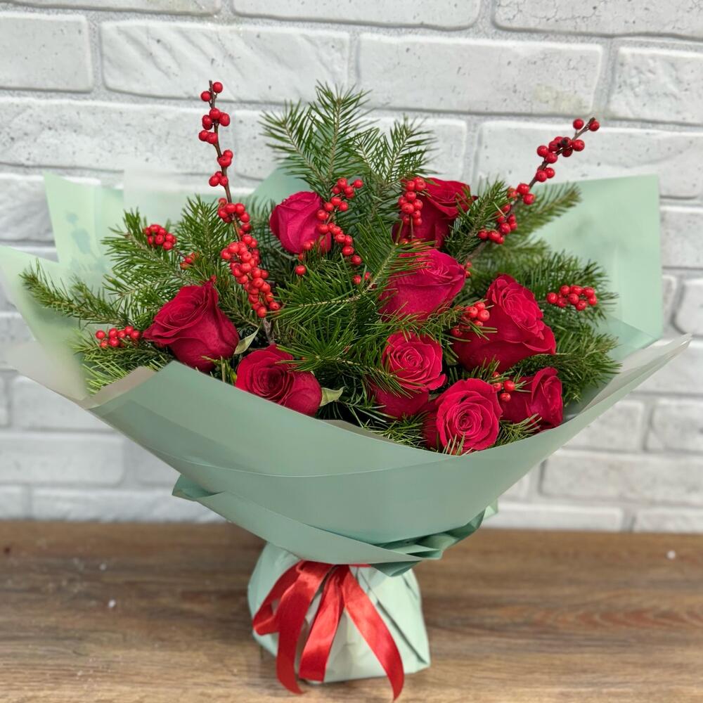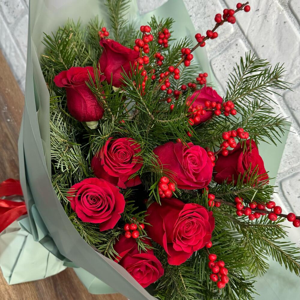 Илекс - 2 шт. Роза - 9 шт. Бумага - 4 шт. Пихта живая - 5 шт.