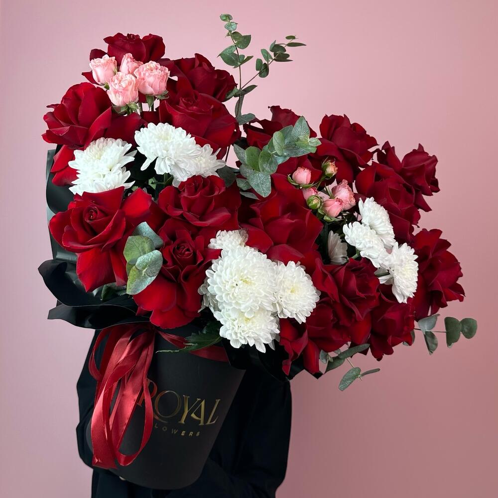 Хризантема кустовая - 3 шт. Эвкалипт - 4 шт. Кустовая роза - 2 шт. Французская роза - 17 шт.
