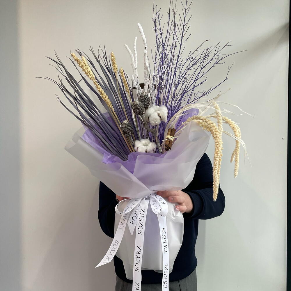 Хлопок - 2 шт. Пшеница (сухоцвет) - 5 шт. сухие ветки - 5 шт. корица на шпажке - 1 шт. пампас сетария - 5 шт. белая ветка заснеженная - 1 шт. лист пальмы крашеный l - 1 шт.