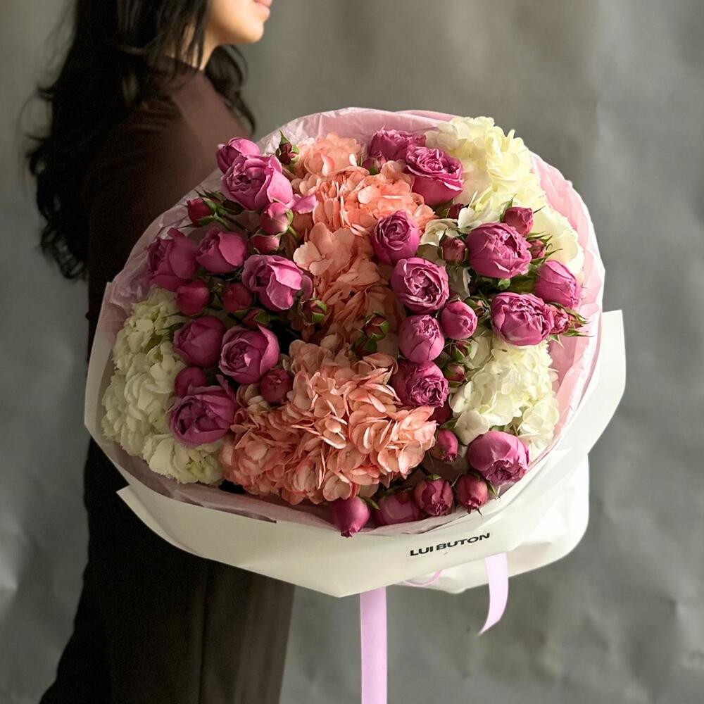 Запоминающийся букет из кустовых пионовидных роз и гортензий, созданный, чтобы удивлять и вдохновлять. Отличный подарок для тех, кто любит стиль и красоту