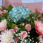 Гипсофила - 3 шт. Гортензия - 1 шт. Хризантема кустовая - 2 шт. Кустовая роза - 3 шт.
