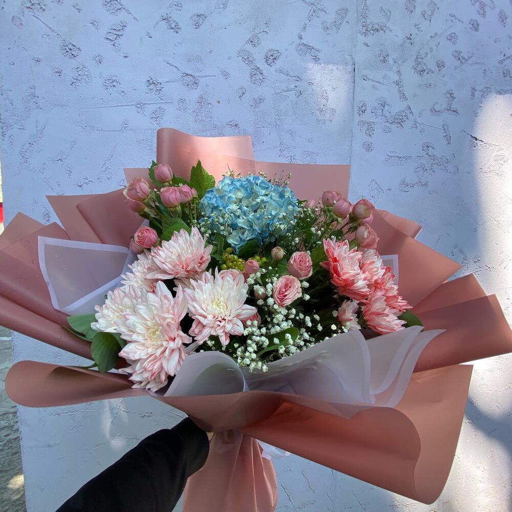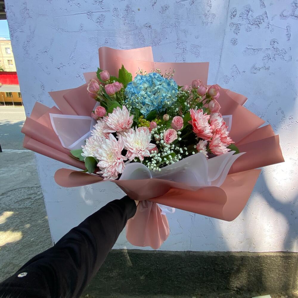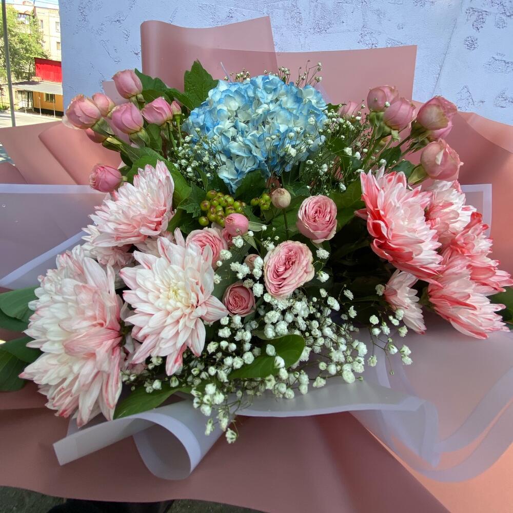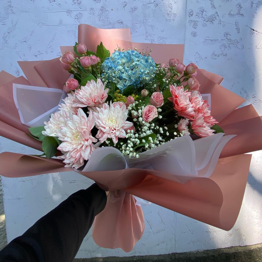 Гипсофила - 3 шт. Гортензия - 1 шт. Хризантема кустовая - 2 шт. Кустовая роза - 3 шт.