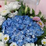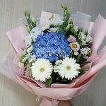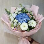 Роза кустовая - 2 шт. Гербера Белая - 2 шт. Гортензия голубая - 1 шт. Лизиантус Алиса Белый - 3 шт.