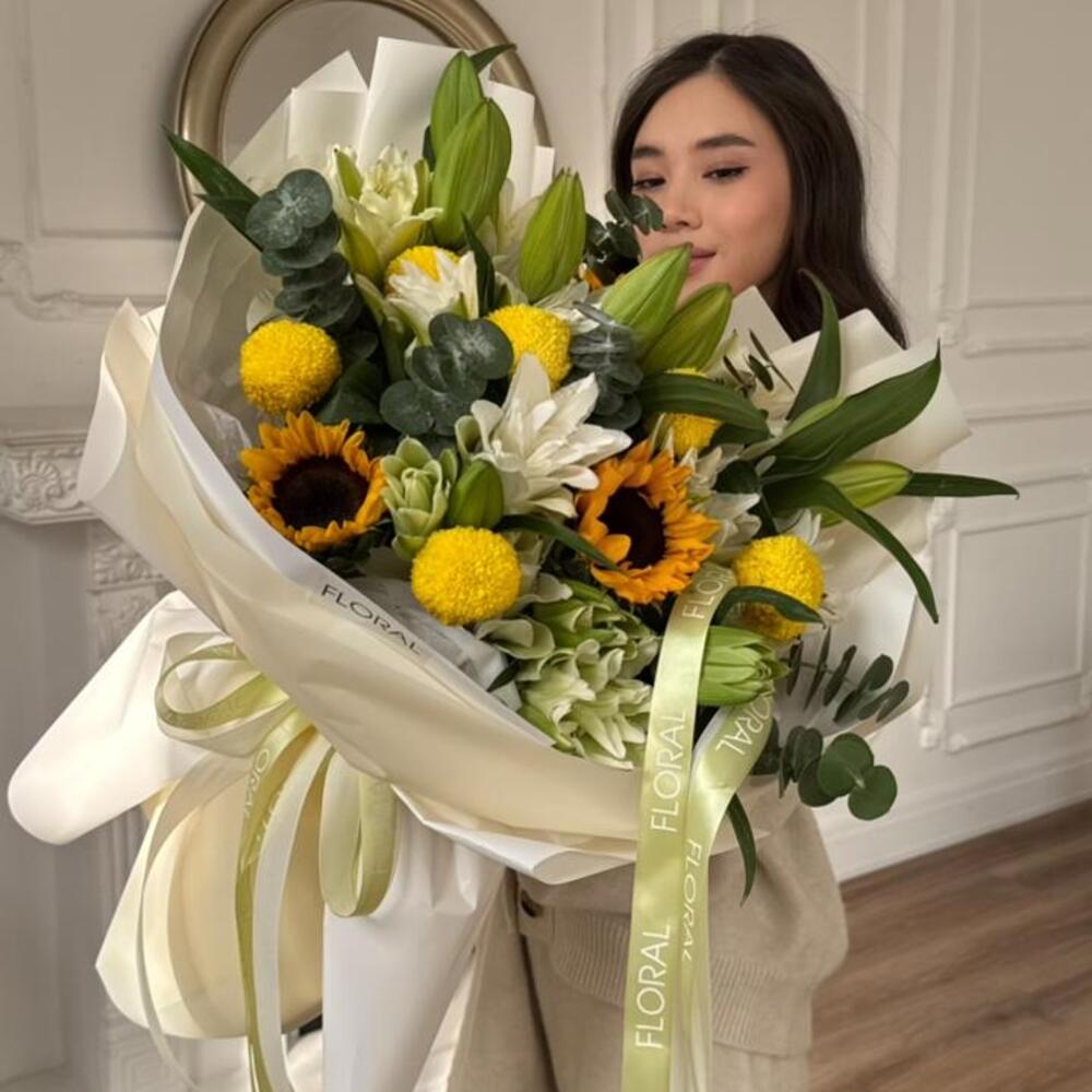 Лилия - 7 шт. Подсолнух - 2 шт. Хризантема одноголовая - 5 шт. Эвкалипт Микс - 1 шт.
