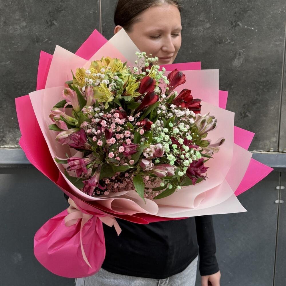 Альстромерия - 9 шт. Дизайнерское оформление - 1 шт. Гипсофила Радужная - 3 шт.