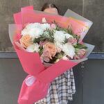 Альстромерия - 3 шт. Роза кустовая - 2 шт. Хризантема кустовая - 2 шт. Фисташка - 2 шт. Дизайнерское оформление - 1 шт. роза микс - 5 шт.