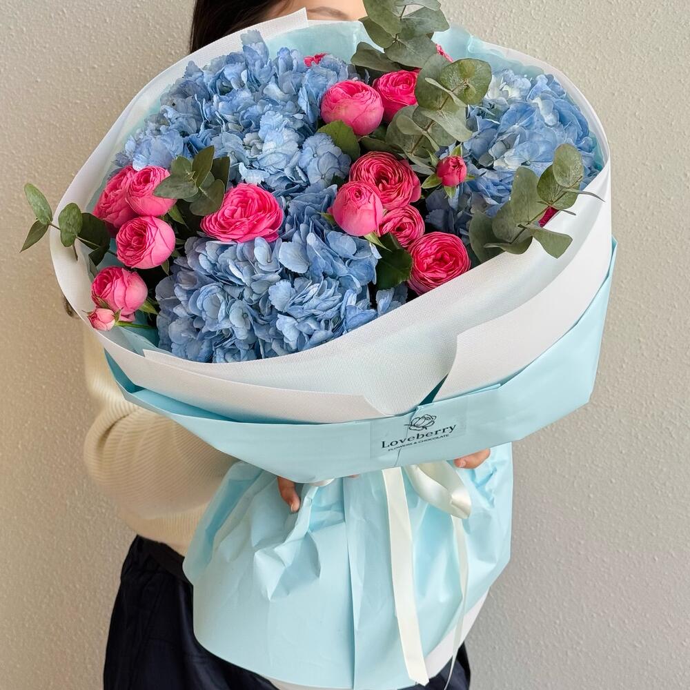 Гортензия - 3 шт. Эвкалипт - 3 шт. Оформление - 5 шт. жизель кустовая роза - 5 шт.