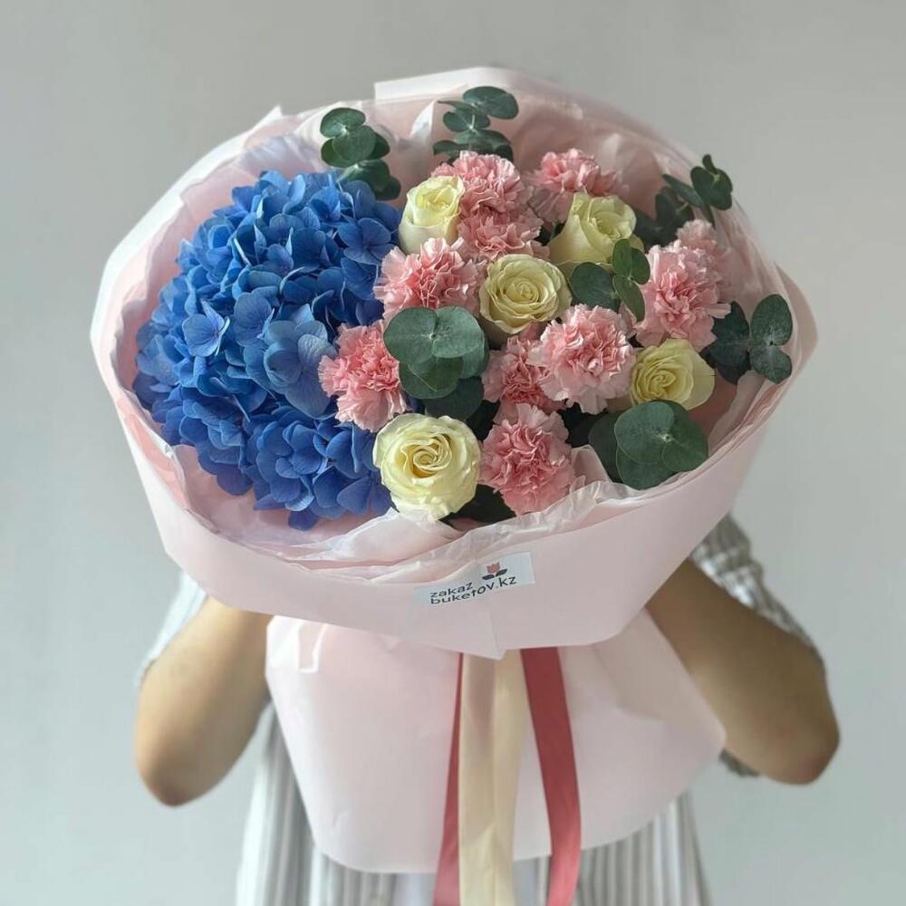 Открытка- 1шт. Лимониум (Голландия) - 1шт. Гвоздика (Голландия)-5 шт. Гортензия (Колумбия)- 1шт. Роза голландская 60 см-5 шт.