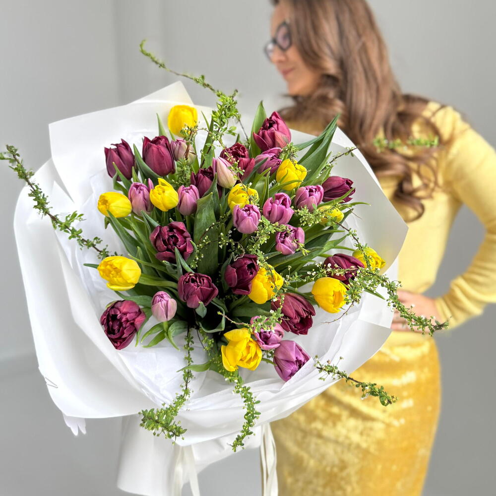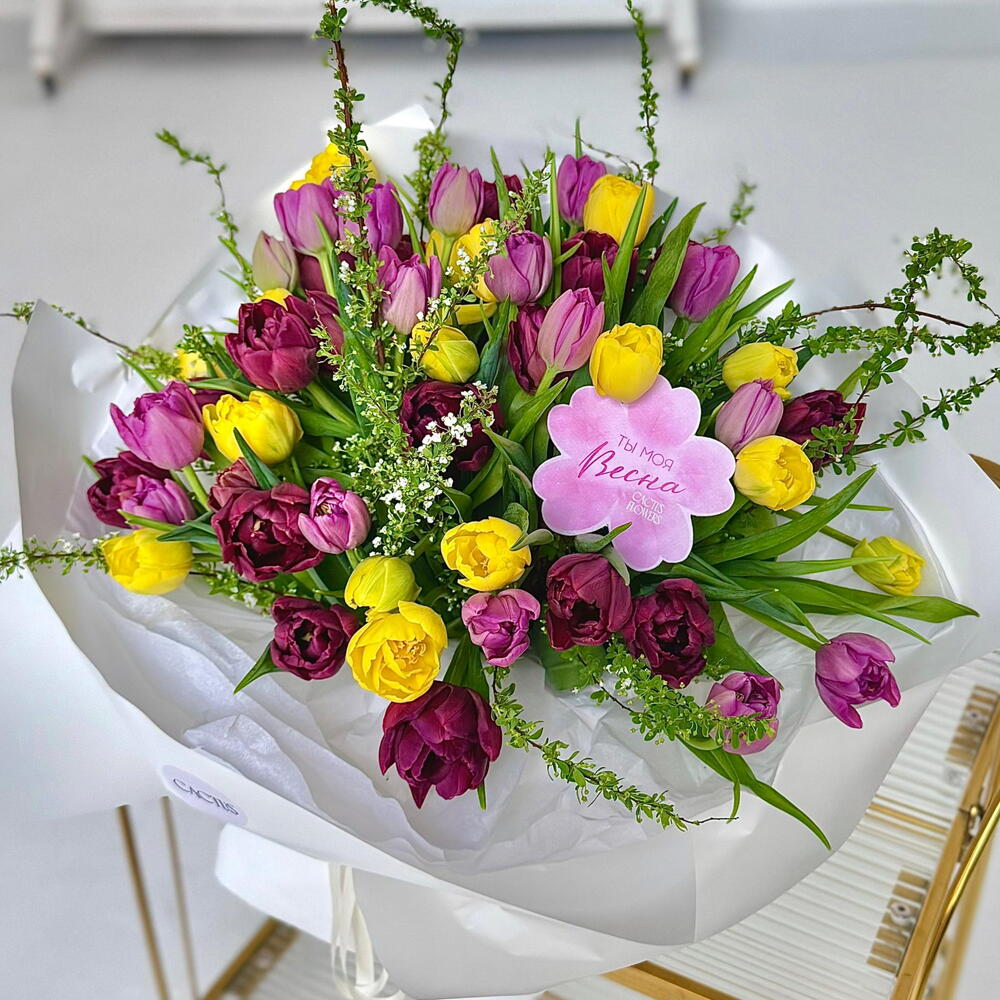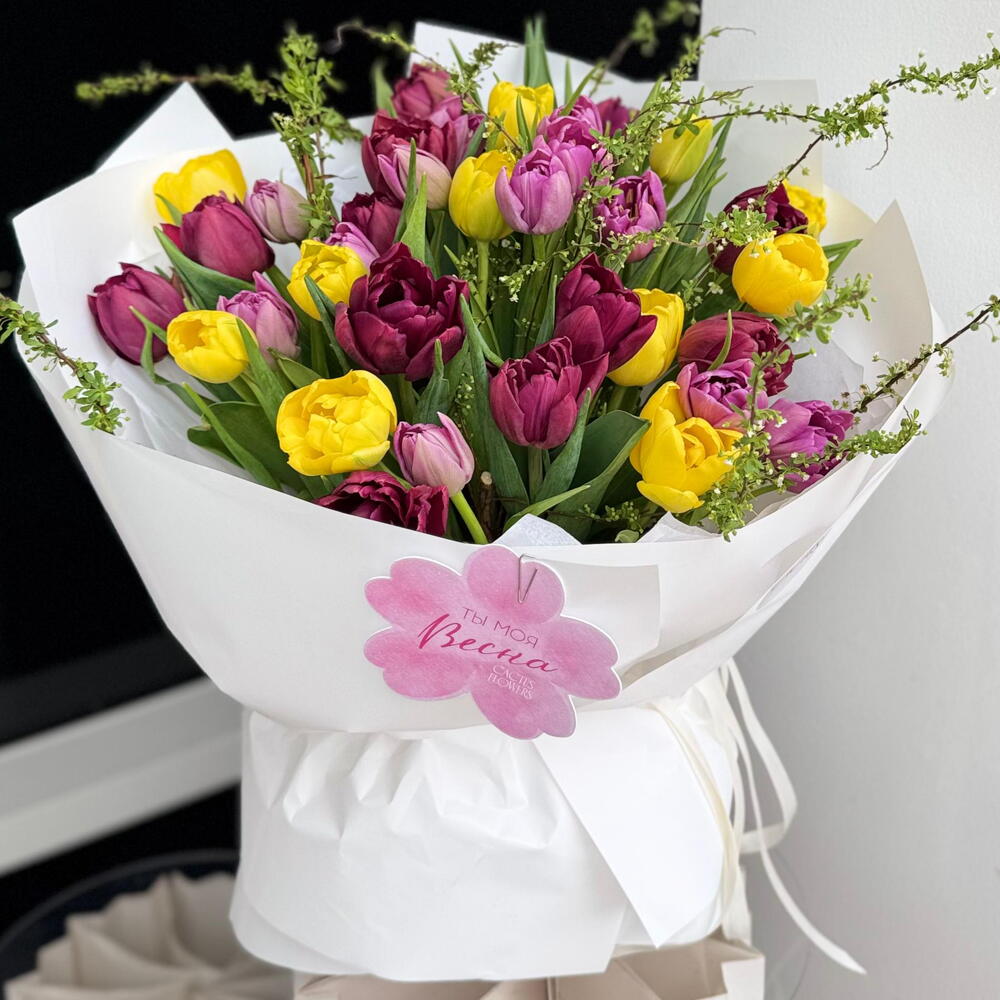 Открытка - 1 шт. Упаковка дизайнерская - 4 шт. Тюльпан премиум - 35 шт. Спирея Грефшейм - 1 шт.