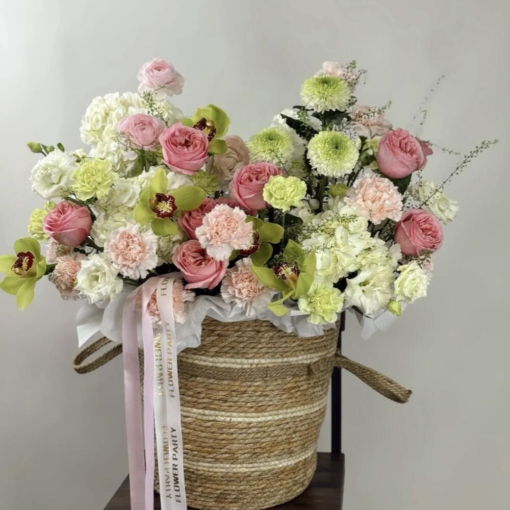 Зелень - 5 шт. Тишью - 6 шт. Оазис - 3 шт. орхидея - 5 шт. Хризантема кустовая mix - 4 шт. гвоздика mix - 21 шт. гортензия колумбия mix - 4 шт. пионовидная роза 50см - 9 шт. писташ mix - 1 шт. хризантема одноголовая mix - 3 шт.