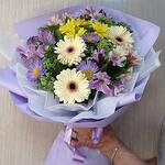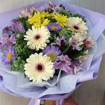 Хризантема кустовая желтая - 1 шт. Астра кустовая - 3 шт. Гербера Крем Спрингс - 3 шт. альстромериямикс европа - 3 шт.
