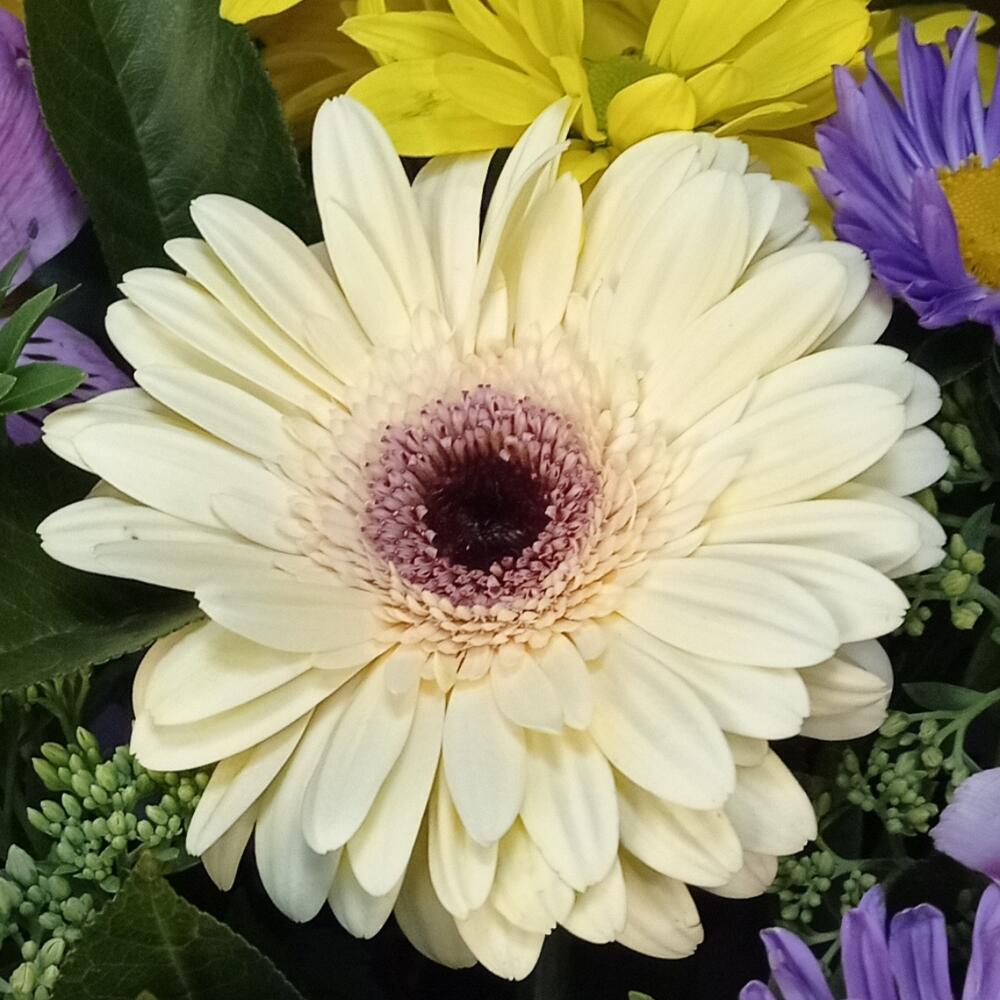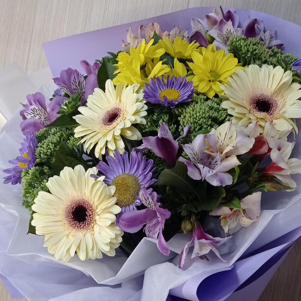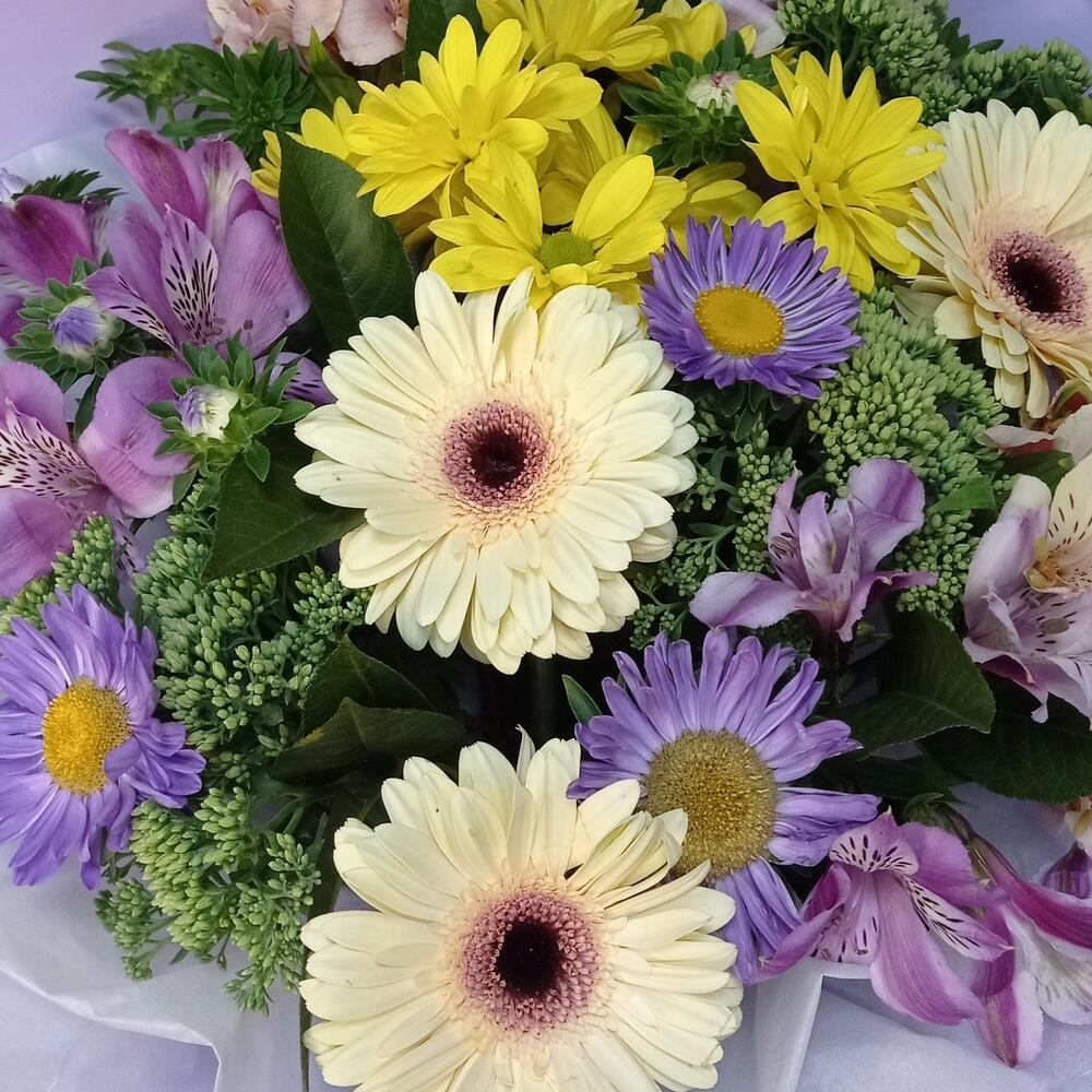 Хризантема кустовая желтая - 1 шт. Астра кустовая - 3 шт. Гербера Крем Спрингс - 3 шт. альстромериямикс европа - 3 шт.