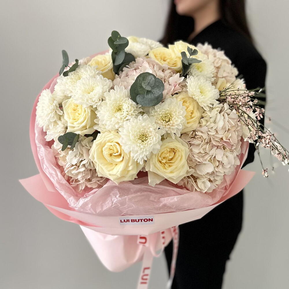 Гортензия - 5 шт. Эвкалипт - 1 шт. Хризантема - 7 шт. пионовидные розы - 9 шт. ваксфлауэр флауэрс - 1 шт.