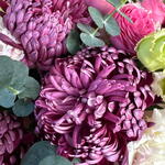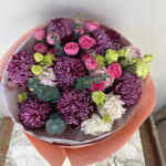Эустома - 4 шт. Лента атласная - 1 шт. хризантема одноголовая бигуди - 7 шт. упаковка тишью и пленка - 8 шт. эвкалипт бебби - 5 шт. спрей роза жизель пионовидная - 4 шт.