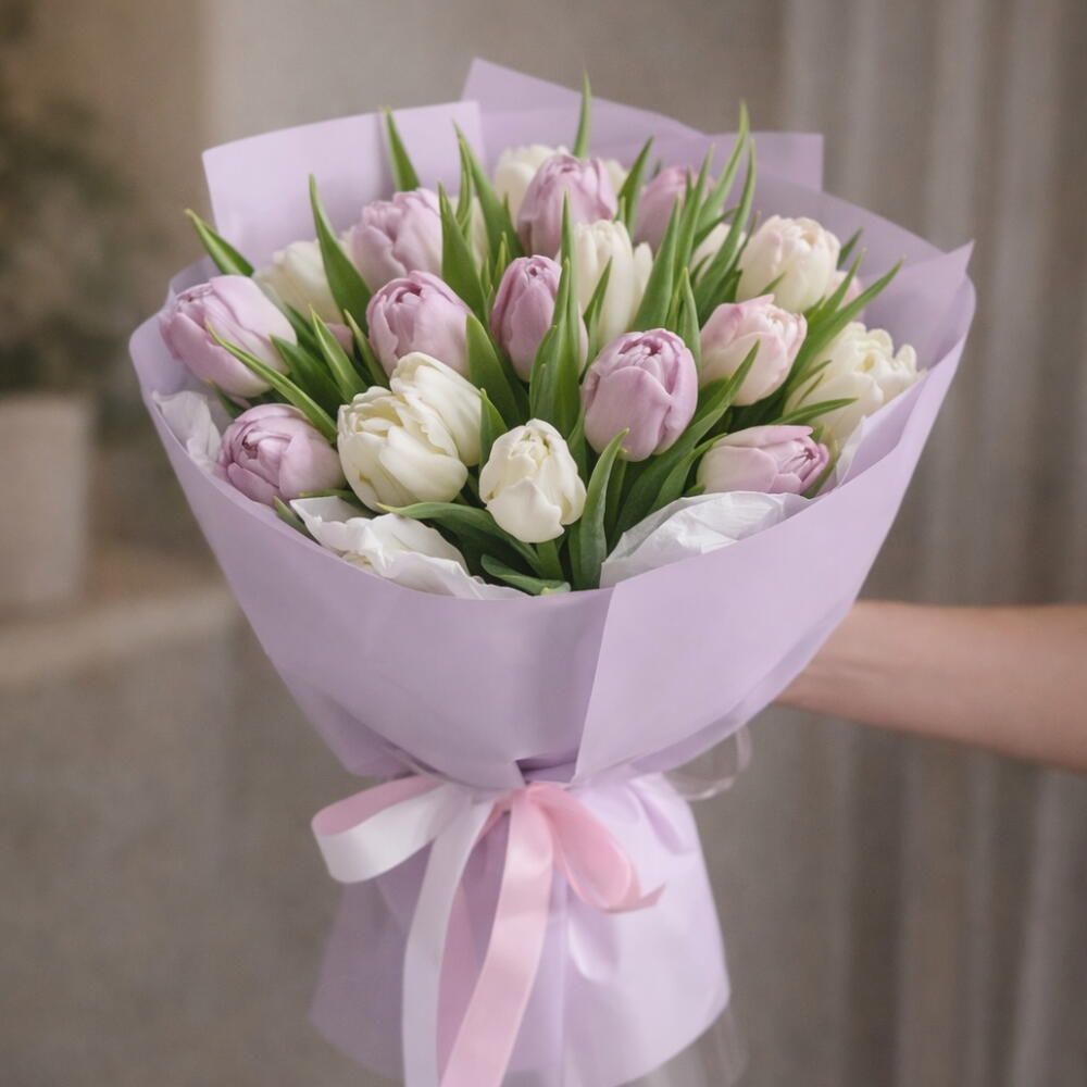 Нежный букет из тюльпанов в мягких лавандовых и белых оттенках, оформленный в стильную пастельную упаковку с атласной лентой. Гармоничное сочетание цветов создаёт ощущение лёгкости, свежести и весеннего настроения. Такой букет станет прекрасным подарком на день рождения, 8 марта, свидание или как трогательный знак внимания без повода. Лаконичный, аккуратный и очень нежный — он дарит улыбку и атмосферу весны.