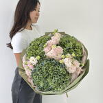 Этот уникальный авторский букет станет идеальным подарком для тех, кто ценит изысканность и красоту. В его состав входит семь штук утонченного Эустома - цветок, символизирующий любовь и уважение. Великолепные три королевские гортензии добавляют цветочной композиции особого объема и шарма. Именно такой букет станет достойным украшением любого события или торжества.