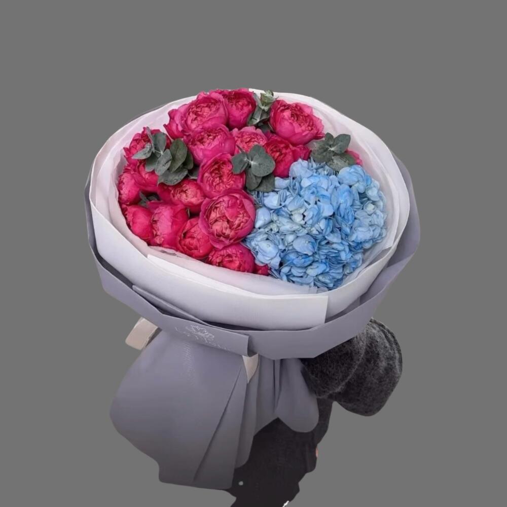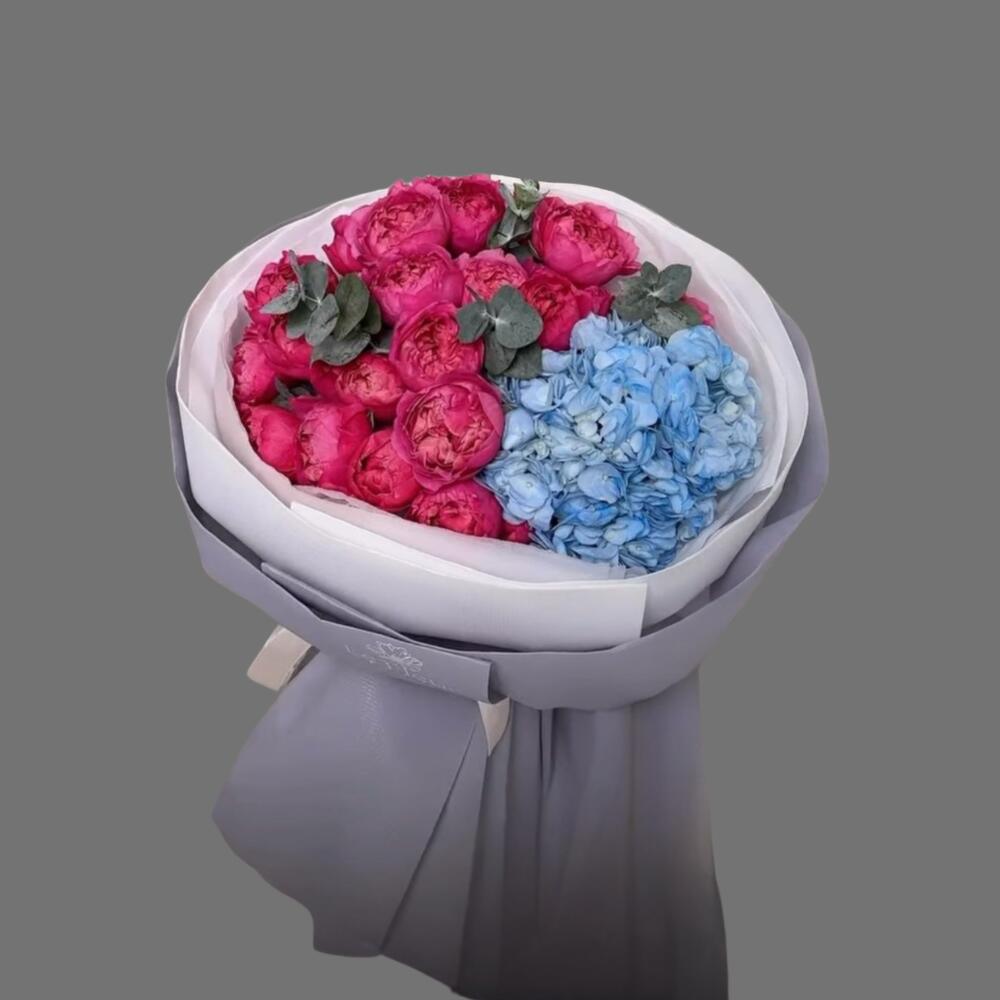 Гортензия - 1 шт. Эвкалипт - 1 шт. Кустовая пионовидная роза - 3 шт. аква бумага - 1 шт.