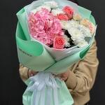 Гортензия - 1 шт. Роза кустовая - 1 шт. Хризантема кустовая - 2 шт. Роза - 3 шт. Упаковка дизайнерская - 4 шт.