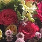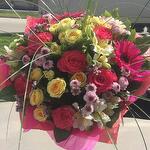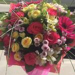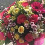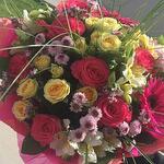 Хризантема кустовая - 5 шт. Роза Эквадор - 5 шт. Роза кустовая кремовая - 5 шт. гербера малиновая большая - 5 шт. альстромериямикс европа - 5 шт.