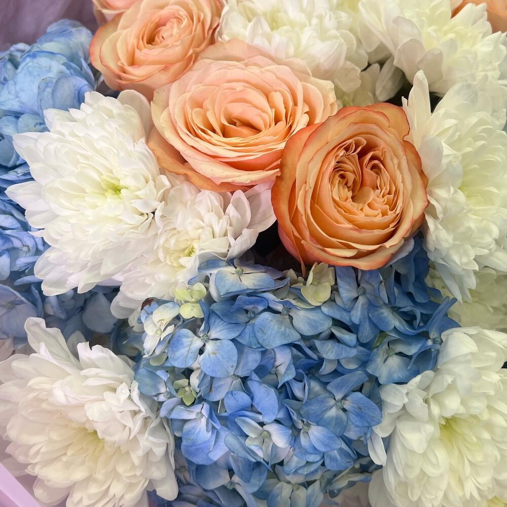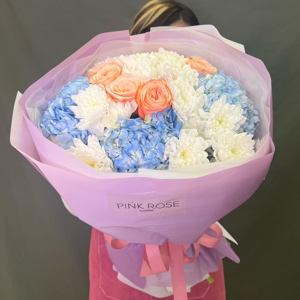 Гортензия - 3 шт. Хризантема кустовая - 4 шт. Роза пионовидная - 5 шт.