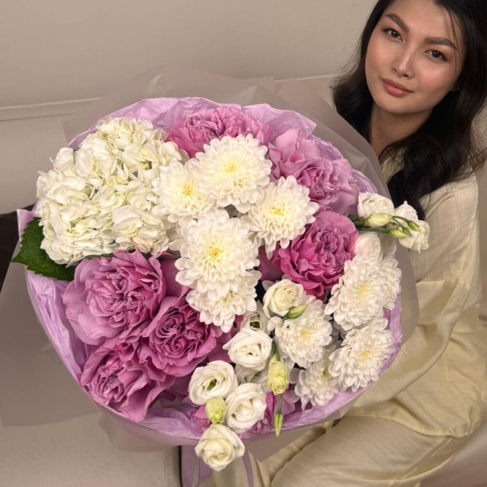 Хризантема кустовая - 2 шт. Роза - 7 шт. Эустома - 2 шт. Упаковка дизайнерская - 3 шт. гортензий - 1 шт.