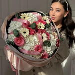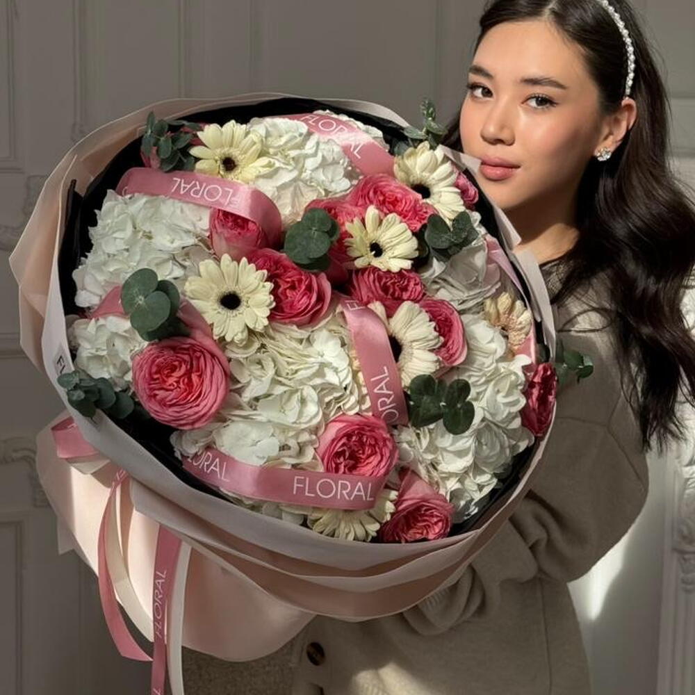 Гортензия - 5 шт. Эвкалипт Цинерея - 1 шт. герберы микс - 7 шт. пионовидные розы - 13 шт.