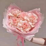 Букет Love– это нежность и изящество в каждом лепестке. В его основе – пять розовых роз, раскрытых особым способом наизнанку, что придаёт им необычный, воздушный вид. Такой букет символизирует искреннюю любовь, лёгкость чувств и тёплую заботу. Оформление выполнено в мягких пастельных тонах, подчёркивая естественную красоту роз. Идеален для романтических признаний, поздравлений с праздником или просто для того, чтобы порадовать любимого человека без повода. Love – букет, который говорит о любви без слов.