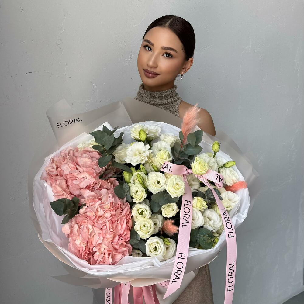 Гортензия - 2 шт. Лизиантус - 10 шт. Эвкалипт - 2 шт. сухоцвет пампас - 3 шт.