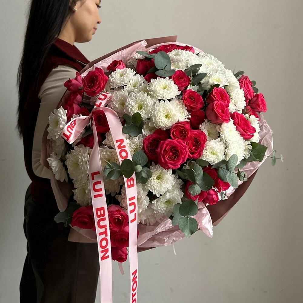 Букет из кустовых роз, хризантем и эвкалипта. Этот букет — пример идеального баланса между элегантностью и естественностью