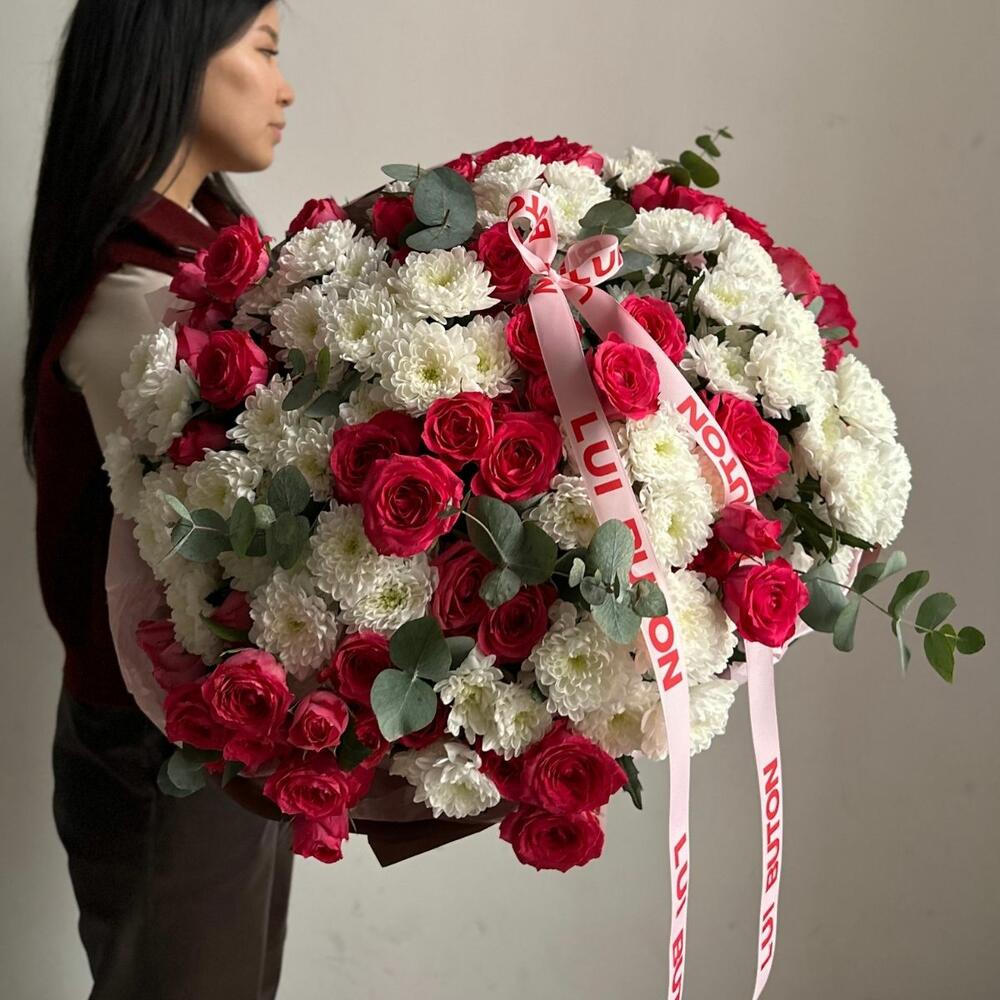 Букет из кустовых роз, хризантем и эвкалипта. Этот букет — пример идеального баланса между элегантностью и естественностью