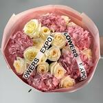 Гортензия - 5 шт. Лента атласная - 1 шт. Упаковка дизайнерская - 3 шт. Кризал (подкормка) - 1 шт. роза candlelight - 15 шт.