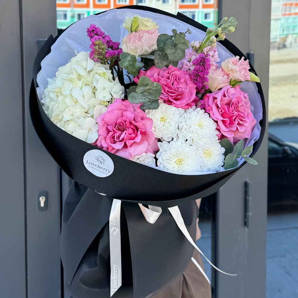 Гортензия - 1 шт. Маттиола - 1 шт. Статица - 1 шт. Хризантема кустовая - 1 шт. Эвкалипт - 1 шт. Эустома - 1 шт. Оформление - 5 шт. country blues - 3 шт.