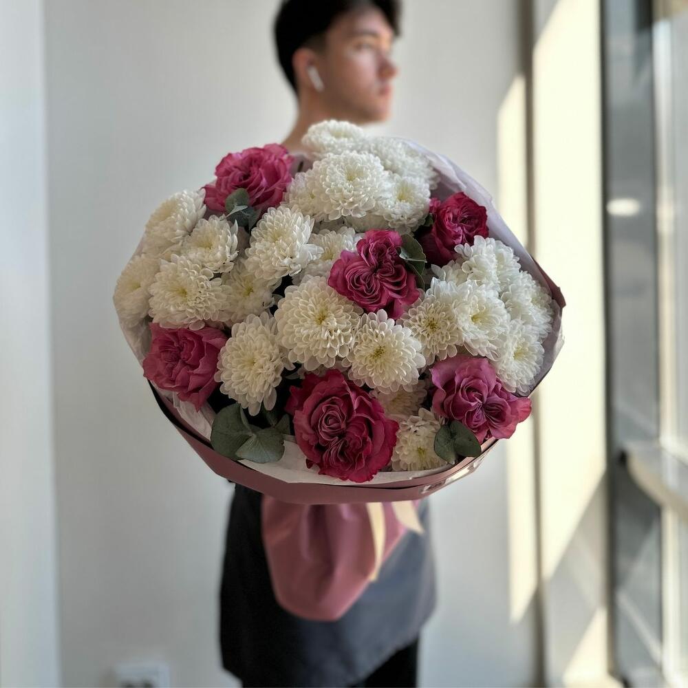 Эвкалипт - 4 шт. хризантемы - 5 шт. пионовидные розы - 6 шт.