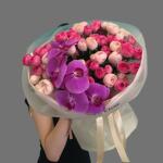 Букет "Малиновый шик" — кустовые розы микс и орхидея цимбидиум