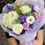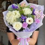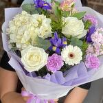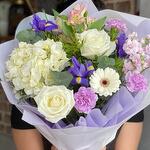 Маттиола - 1 шт. Гербера - 1 шт. Диантус - 3 шт. Гортензия белая - 1 шт. Ирис Blue Magic - 3 шт. Роза белая 50 см - 2 шт. альстромериямикс европа - 1 шт.