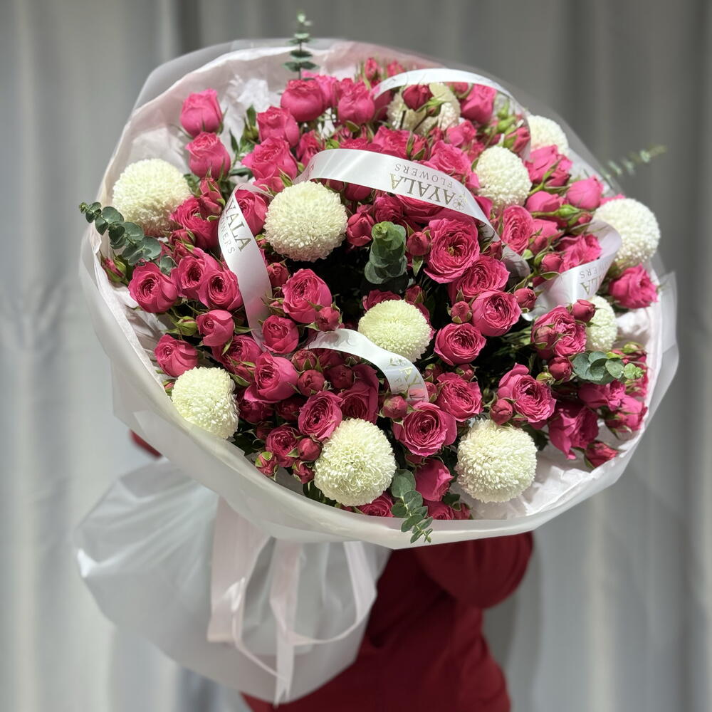Эвкалипт - 1 шт. Кустовая роза - 15 шт. момоко хризантема - 11 шт.