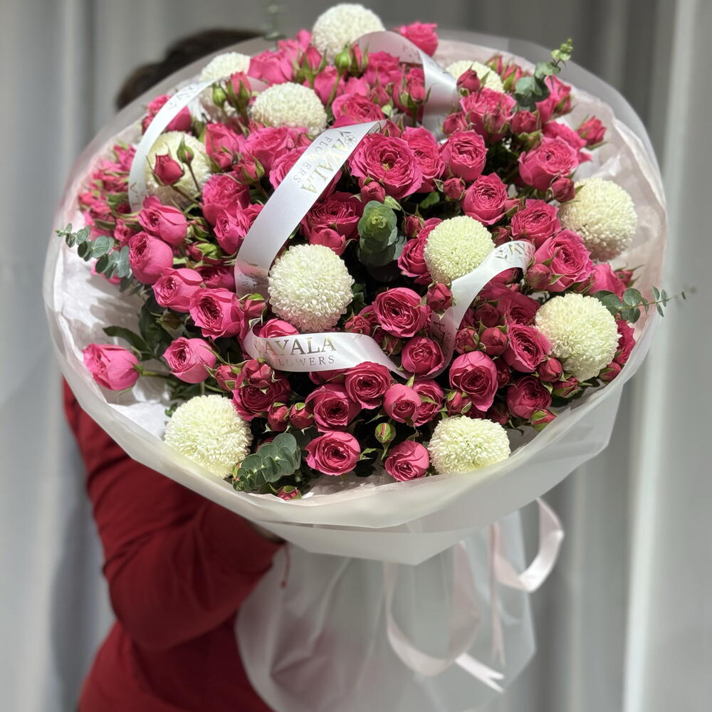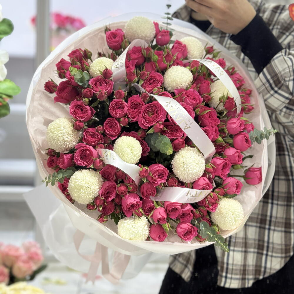 Объёмный букет «Milan» — это стиль, утончённость и современная классика в одном оформлении. В составе — 15 веток кустовых роз, из них 11 нежных роз сорта Momoko, которые придают композиции мягкий пудрово-розовый оттенок и особую воздушность. Кустовые розы создают эффект пышности и многослойности: десятки аккуратных бутонов раскрываются постепенно, радуя своей красотой не один день. Букет выглядит дорого, эстетично и при этом очень нежно. ✨ Пышный и объёмный формат ✨ Нежная розовая гамма ✨ Идеален для признаний, дней рождения и особенных моментов «Milan» — это букет с характером: сдержанная элегантность и лёгкая романтика, которая остаётся в памяти надолго.