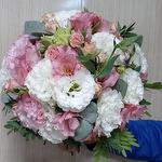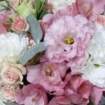 Роза кустовая розовая - 5 шт. Лизиантус Алиса Белый - 6 шт. Эвкалипт Baby Blue - 3 шт. альстромериямикс европа - 4 шт.