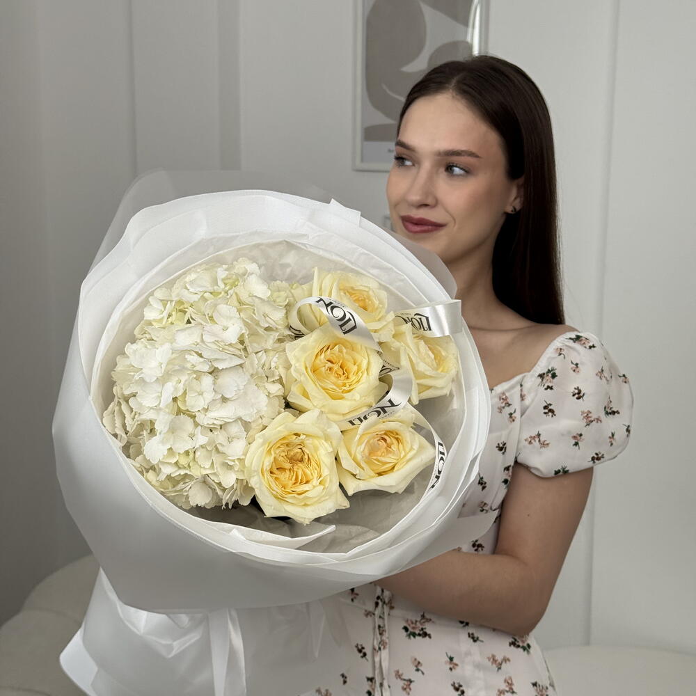 Гортензия - 1 шт. пионовидные розы - 5 шт.