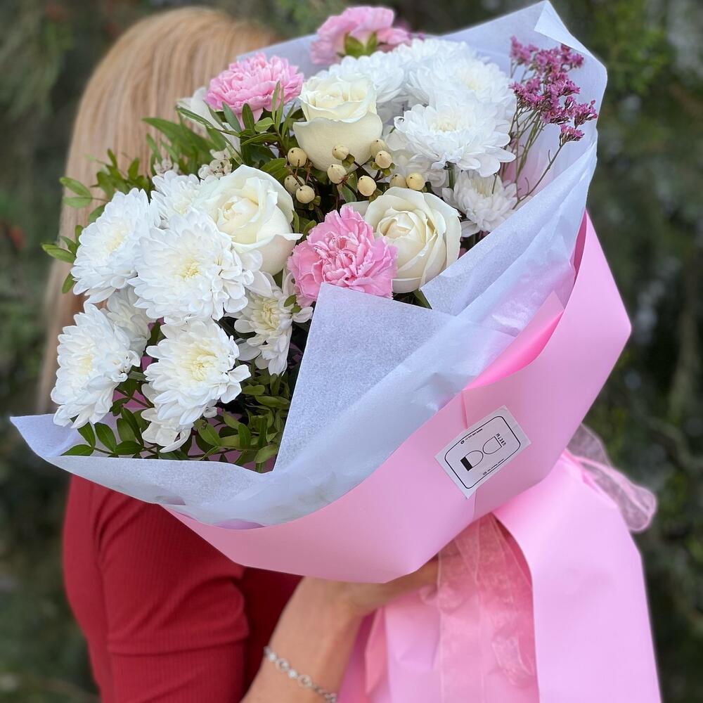 Хризантема кустовая - 2 шт. Роза - 3 шт. Гвоздика - 3 шт. Фисташка - 4 шт. Дизайнерское оформление - 1 шт.