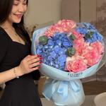 Контрастный и изысканный букет в сочетании небесно-голубых и розовых оттенков. Легкость гортензии и бархатистость роз создают атмосферу свежести и утончённой романтики. Этот букет — как дыхание морского бриза и тёплый закат в одном объятии 😻