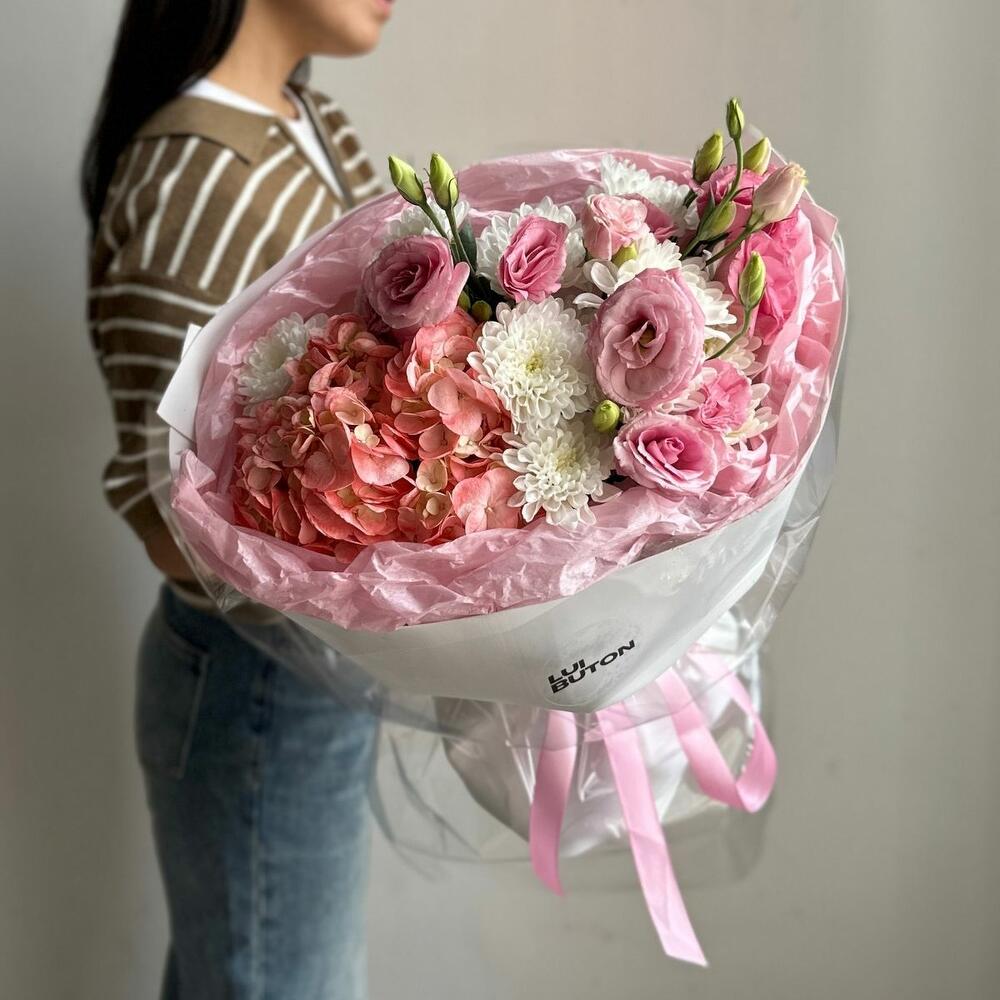 Нежный букет из гортензии, хризантем и эустом с акцентом на детали. Идеальное сочетание свежести и элегантности для подарка любимым и близким.
