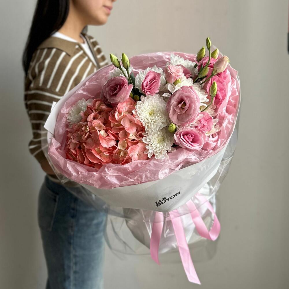 Гортензия - 1 шт. хризантемы - 4 шт. эустомы - 3 шт.