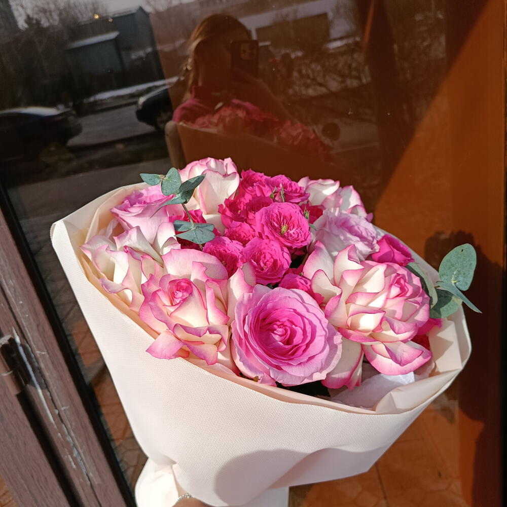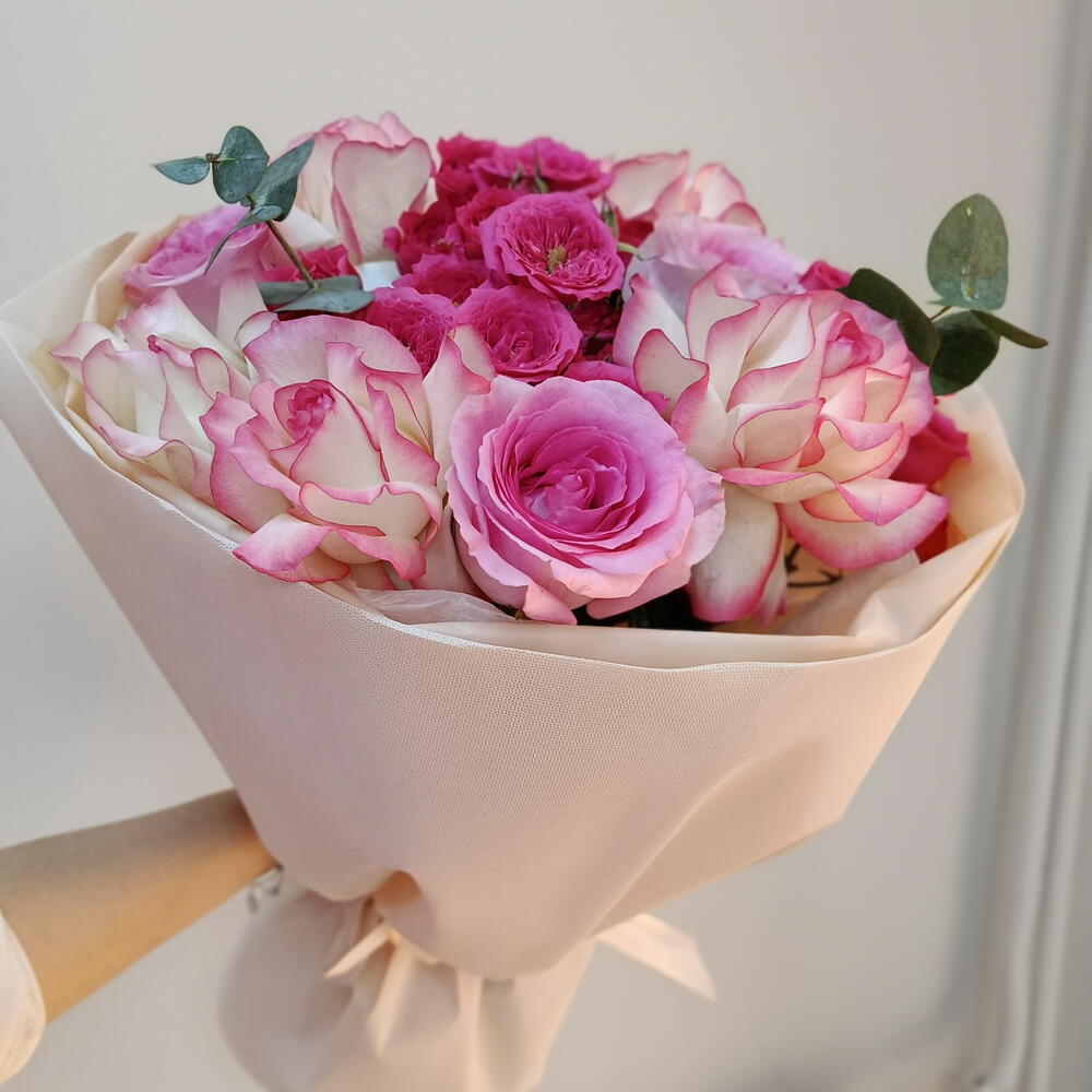 Букет с французской розой Джумилия, эвкалиптом и мандалой - нежная классика с характером 🤍 Изящная роза Джумилия с её утончённым бело-розовым оттенком придаёт композиции романтичность и лёгкость. Ароматный эвкалипт добавляет свежести и воздушности, а мандала завершает образ, делая букет стильным и современным. Свежая поставка, аккуратная сборка и внимание к каждой детали 🌿