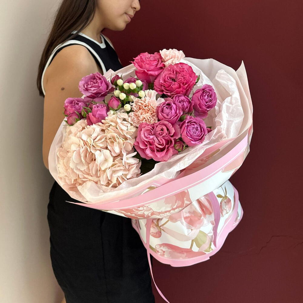 Гиперикум - 1 шт. Гортензия - 1 шт. Диантус - 1 шт. пионовидные розы - 1 шт. кустовые розы - 3 шт.