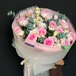 Нежный букет в розовой палитре из роз сорта мандала и розового лизиантуса с добавлением ароматного эвкалипта. Лёгкая и утончённая композиция, которая символизирует чистоту, гармонию и спокойствие. Идеальный вариант для поздравления с Днём рождения, юбилеем, свадьбой или просто чтобы подарить радость близкому человеку.