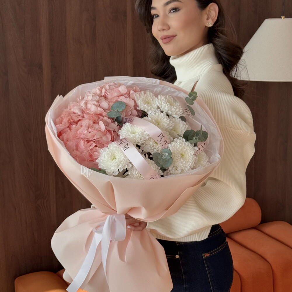 Гортензия - 2 шт. Хризантема кустовая - 3 шт. Эвкалипт - 2 шт.