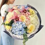 Эвкалипт - 1 шт. ЦИМБИДИУМ - 3 шт. гортензии - 5 шт. пионовидные розы - 4 шт. кустовые розы - 3 шт.