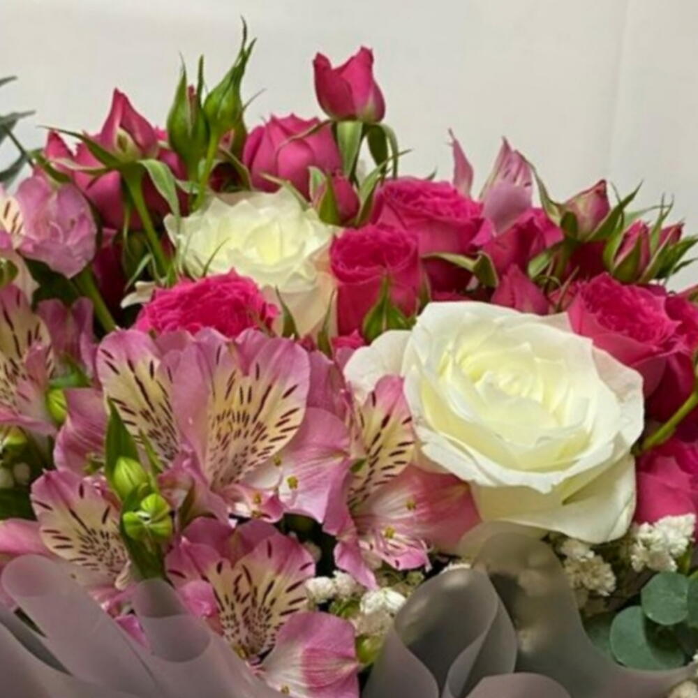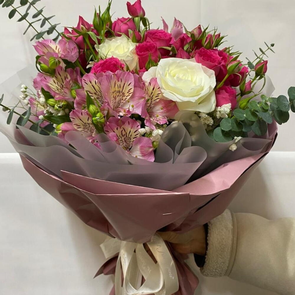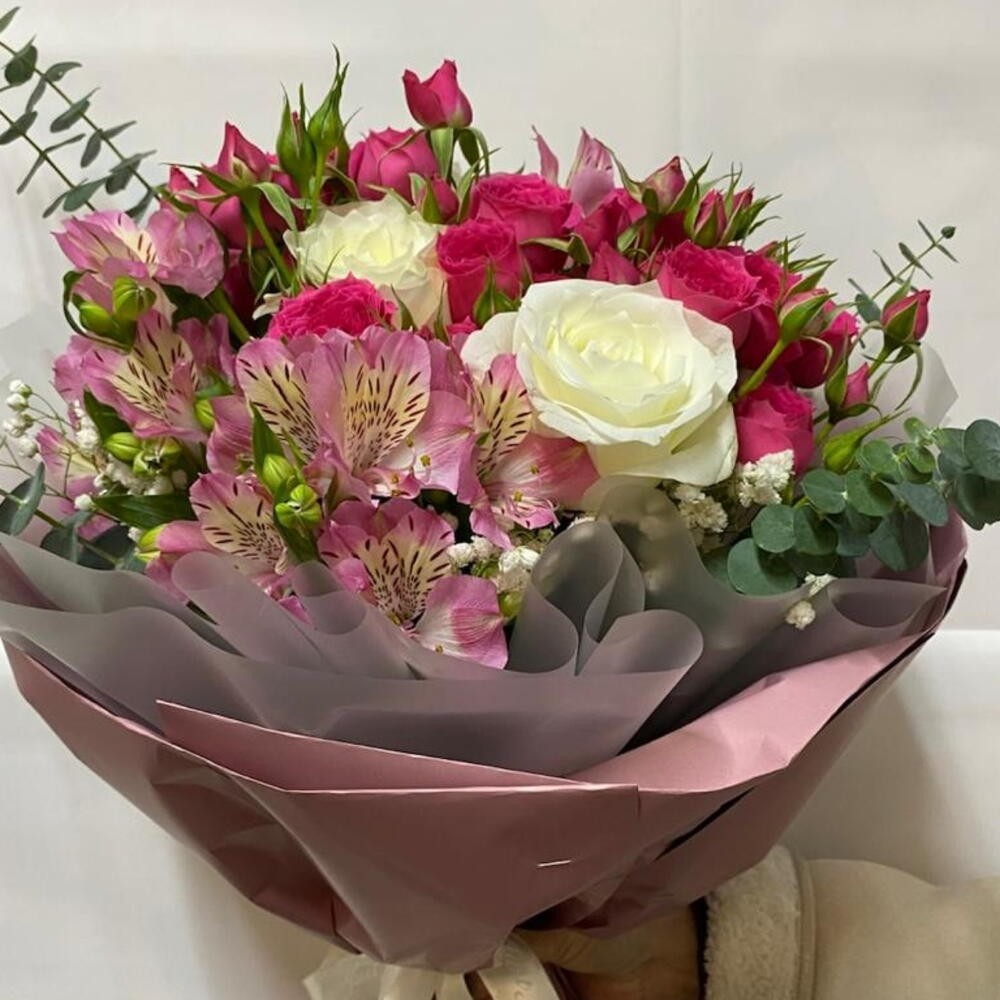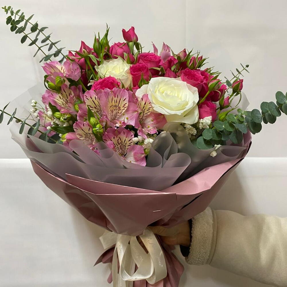 белая роза 60 см - 3 шт. спрей роза "софия" - 3 шт. алстроеиерия розовая - 3 шт.