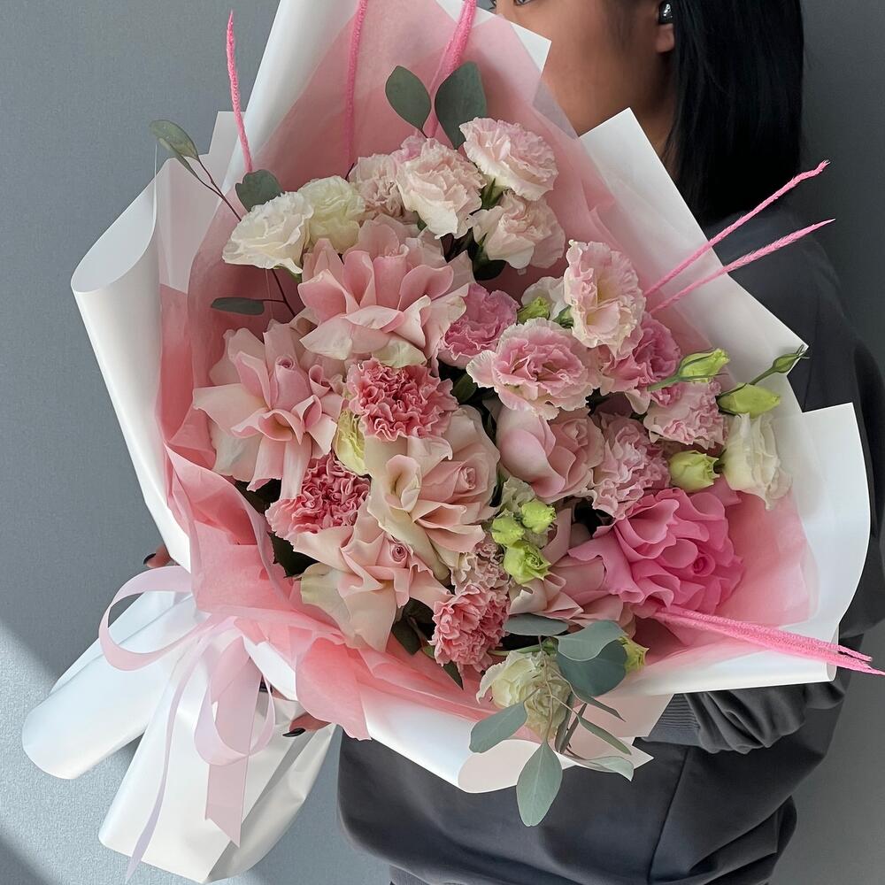 Эвкалипт - 1 шт. Эустома - 5 шт. Диантус - 3 шт. Сухоцветы - 6 шт. французские розы - 5 шт.